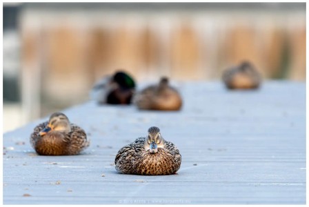 Még a legprofibb úszóknak is kell a pihenés! Amikor épp nem a víz alatt kutatnak magvak, apró halak vagy ebihalak után (mert bizony mindenevők), imádnak csoportosan a stégeken tollászkodni vagy szundítani egyet. A parti köveken vagy faépítményeken gyakran látni őket így, békésen szemlélődve.